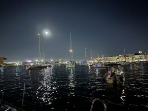 Das Boot, das bei uns festmachte, war eine wunderschöne Beneteau 57 und das luxemburgische Paar (Denise und Jiem) auf Anhieb sympathisch. Schnell stand der kühle Rosé auf dem Tisch und auch Gudrun und Tom kamen dazu. Wir verbrachten einen wunderbaren Abend zu sechst. Die ganze Stadt feierte das Feuerwerk in Booten auf dem Wasser und wir feierten mit. Ein Erlebnis, das man nicht missen möchte.
